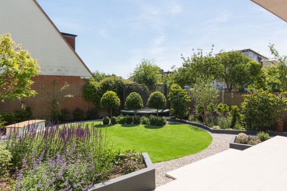 Low maintenance, evergreen structural varieties dominated the planting including box hedges emphasising the radius, bay, prunus lusitanica and pittosporum. Large drifts of salvias and sedums for long flowering seasonal colour were incorporated in a prominent bed raised to patio level filtering direct views to the garden beyond.
