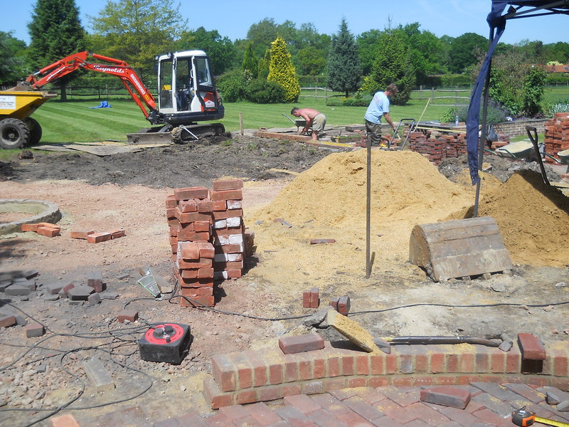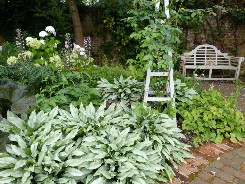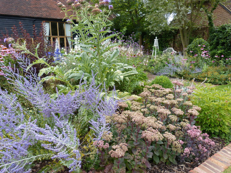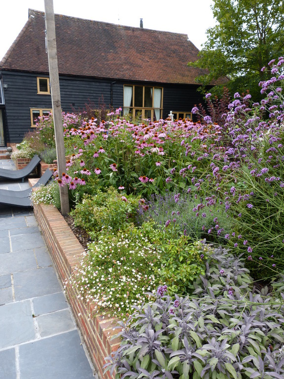 The perennial garden was a prominent 260 sqm area outside the sitting room windows. With less than a month before a major summer party, DIG was challenged with a tight programme. The client had designed a cruciform herringbone brick path incorporating a central millstone. Planting within the four resultant beds was characterised by large drifts of bold planting designed by DIG.