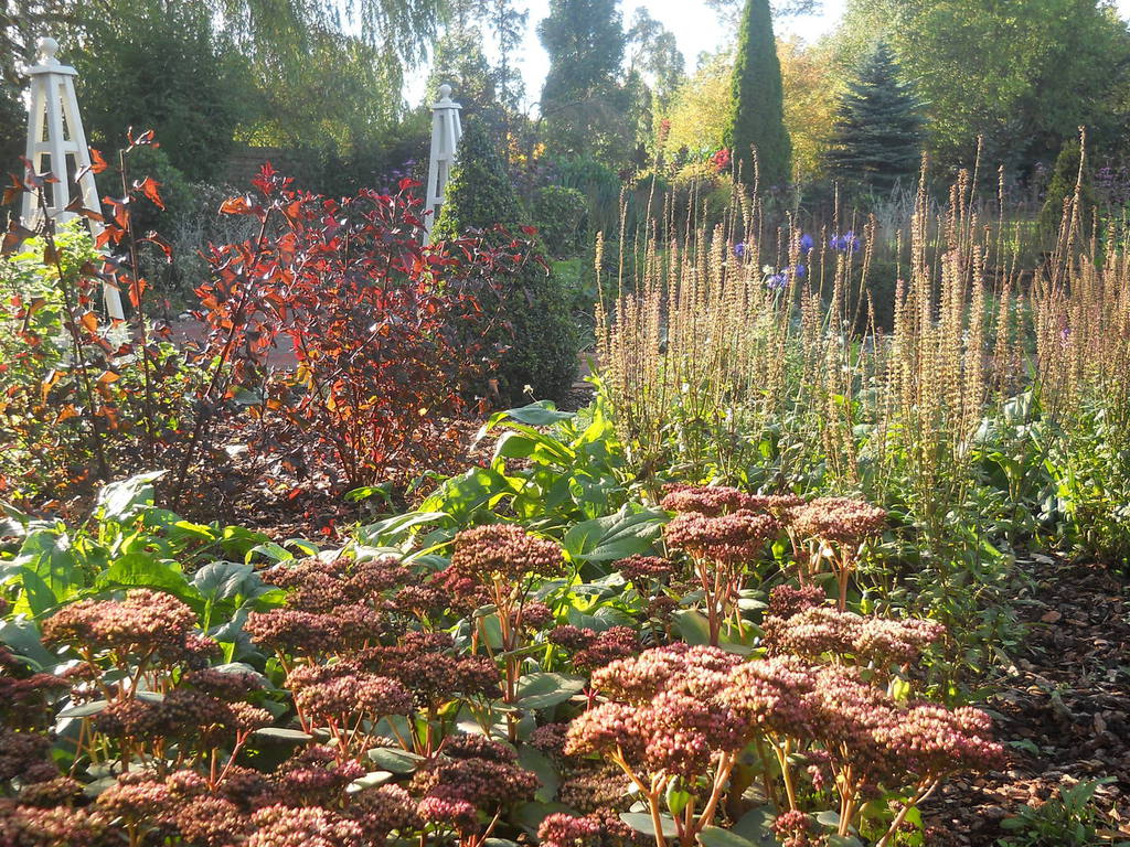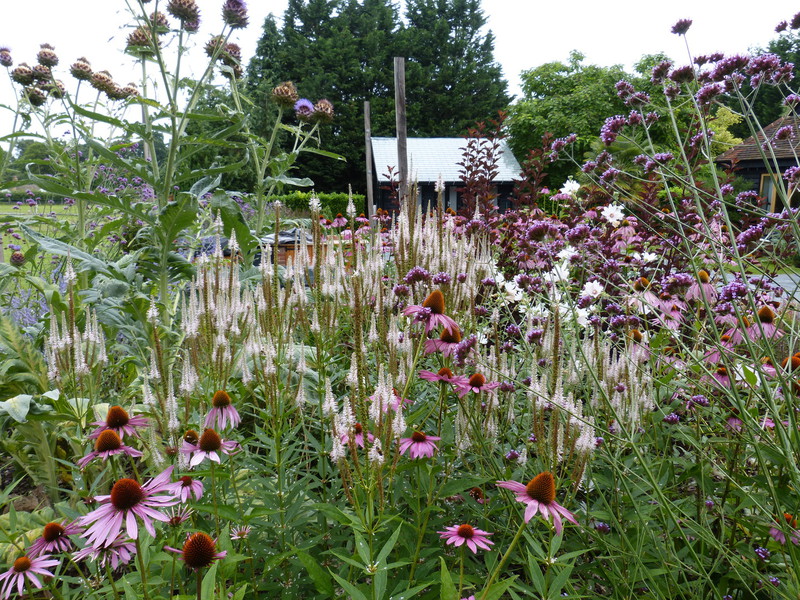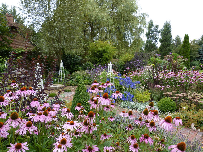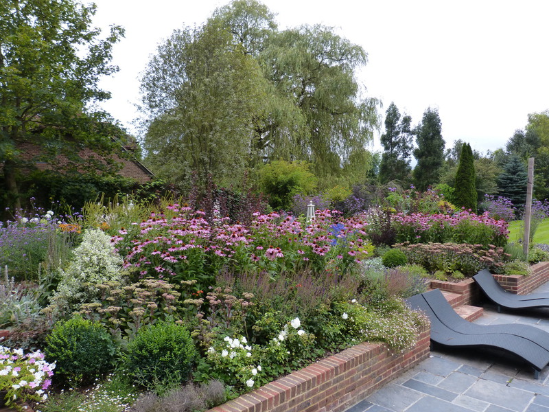 Elsewhere planting was an amalgam of new perennial style and traditional cottage garden favourites including large drifts of Echinacea’s, Veronicastrum, and Sedum matrona, providing fabulous summer colour. Groups of clipped box balls and drifts of spring bulbs extended the season of interest. Climbing roses on four feature pergolas providing instant height.