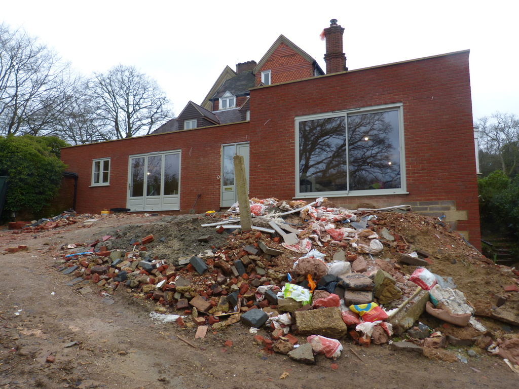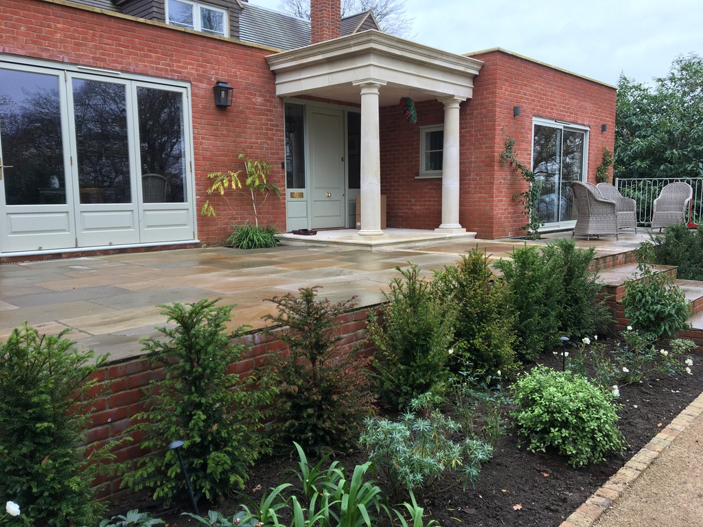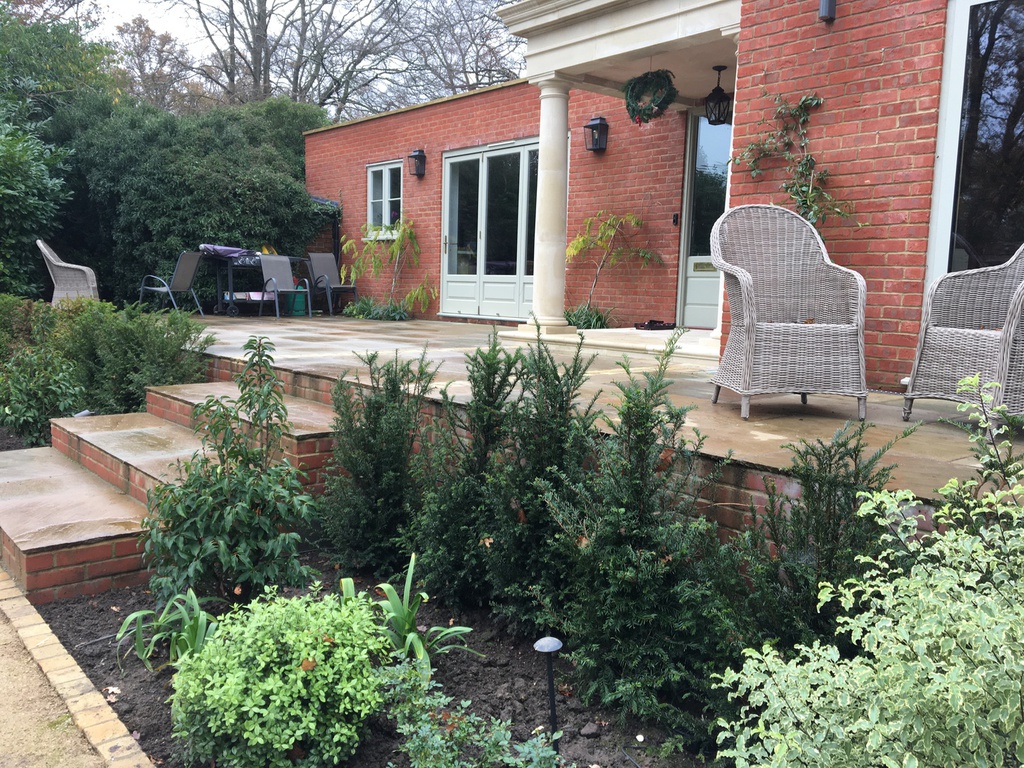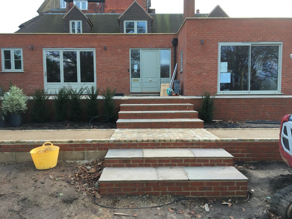 Following the completion of a new extension to part of a victorian mansion, this complex project required a new patio, disssected by the access to the front door and crossed with a perpendicular path to the lower garden. The impact of tall supporting walls required for the significant level changes, was lessened with terracing and planting. Phase two will address drive and parking.