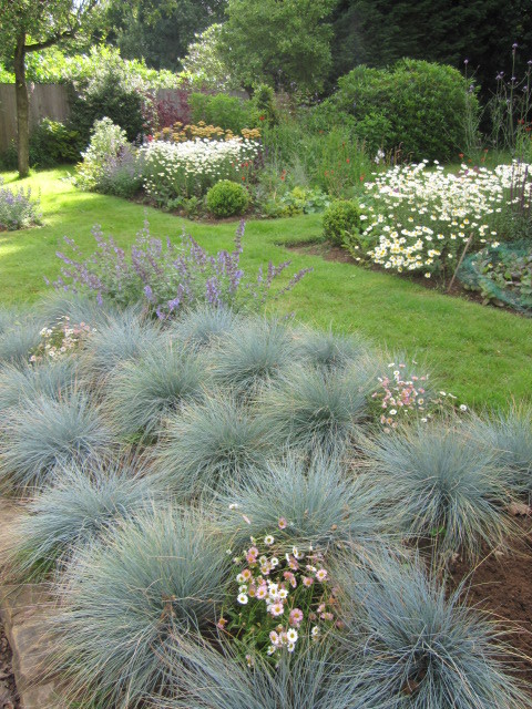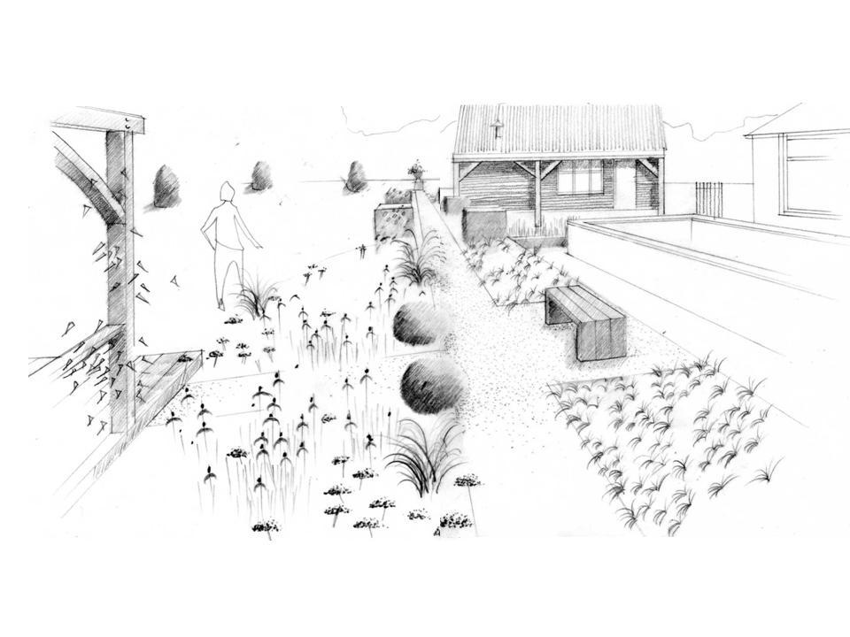 Forming a ‘gateway’ from the terrace to open lawns beyond, DIG introduced a quadrant of Yew cubes for winter structure. From here led a long pathway bordered by planting beds. To one border a simple carpet of the silver grass Festuca Elijah Blue was interspersed with the small daisy Erigeron karvinskianus, resilient to occasional trampeling of children exiting the adjacent pool.