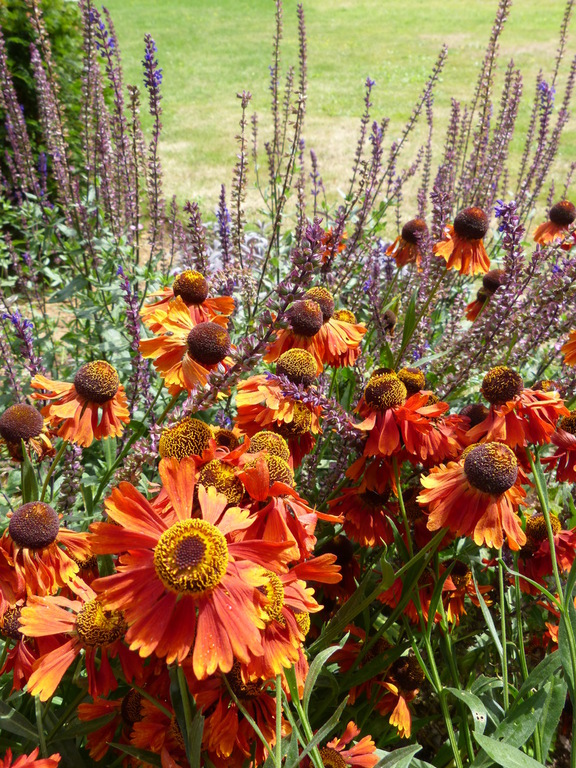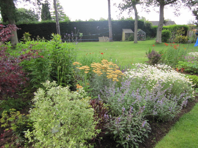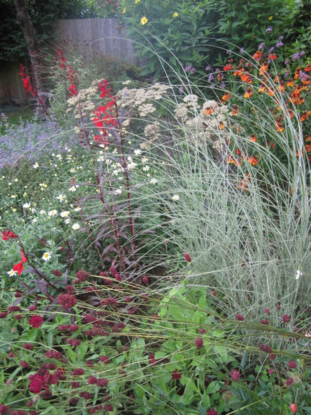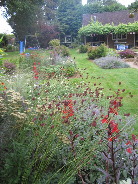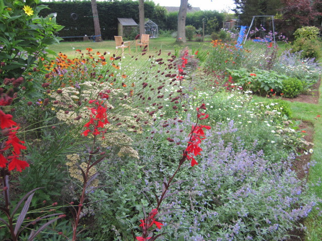 The other border was planted with a rich tapestry of long flowering perennials in hot colours including firery red Crocosmia lucifer, plum Sanguisorba tanna, acidic yellow Alchemilla, with Achillea terracotta, Geranium psilostemon, and Geum Mrs J Bradshaw.