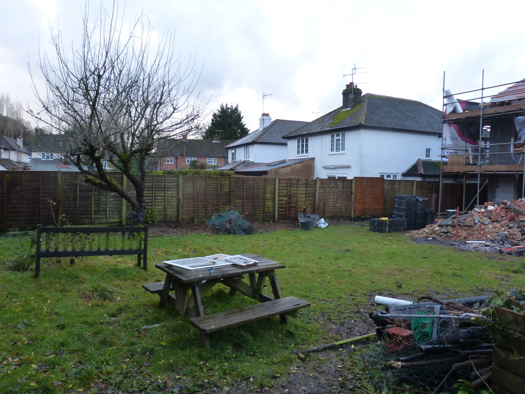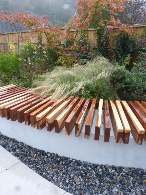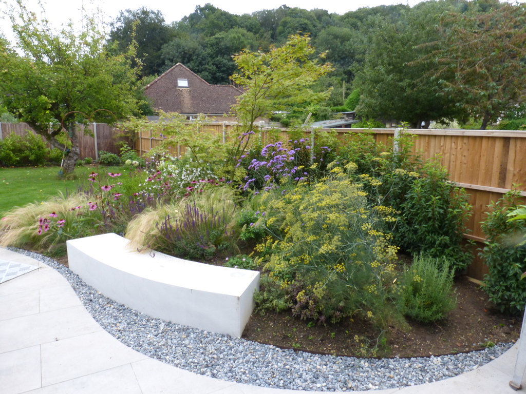 Having refurbished the interior of their new home the garden was a blank canvass having been cleared of all but a lone apple teee. The couple wanted a generous social space to entertain family and frends, and provide a calm escape from the demands of their rapidly expanding business and challanges of a care role at the local cancer centre.