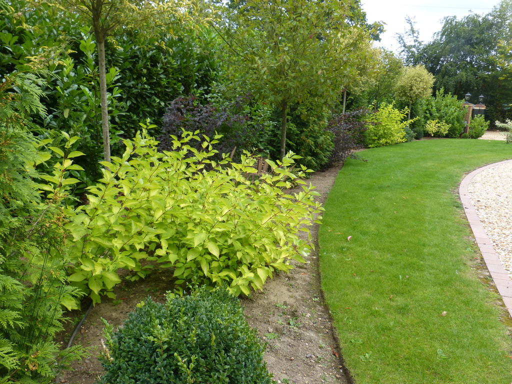A deep band of primarily evergreen planting was introduced along the boundary. DIG was keen to avoid obvious 'screening' so a range of plants with contrasting leaf forms, colour and scale were adopted to provide variety. Groups were repeated to unify the substantial boudary; tall ligustrums, photinias and prunus lusitanica to give height. Viburnum and physocarpus for mid level screening and seasonal flowers, box and liriope for a low weed suppressing membrane.
