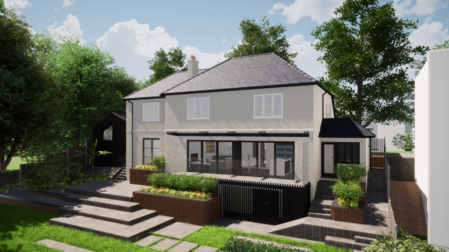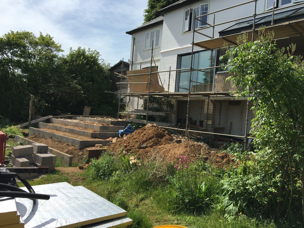 following the complete redevelopment of the property, design a terraced patio linking the kitchen level with the garden 3 metres below, whilst capitalising spectacular views across to the Northdowns.