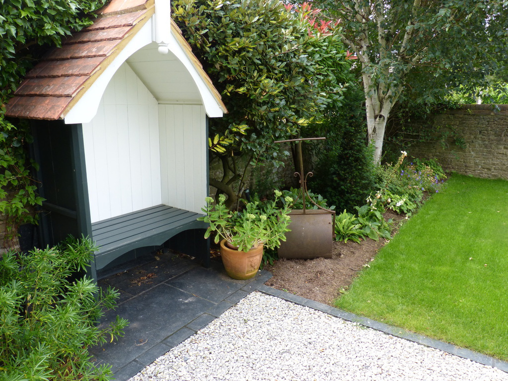 A classic period gazebo, customized with original tiles slavaged from the house restoration provided a hidden resting place from which to enjoy this tranquil escape.