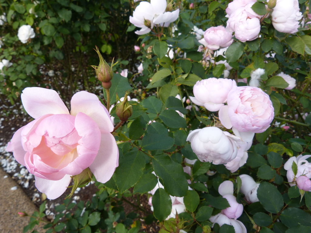 Yew hedging subdivided the garden and created a screen from new parking, relocated to the side. Three elegant Prunus lusitanica trees, to be clipped as topiary boxes, provided vertcal interest with underplaning of traditional classics including Rose Gertude Jekyll, Geranium rozanne and fragrant sarcoccoa for winter structure.